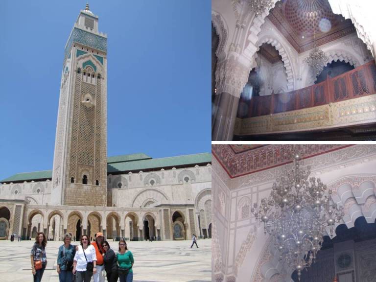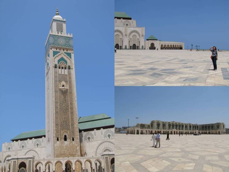 La famosa Mezquita de Hassan II, se localiza en el Boulevard Sidi Mohammed Ben Abdallah (dirección Aïn Diab), barrio de las chabolas, haciendo nuestra primera parada, que luego de una pequeña explicación de nuestro guía bajo el radiante sol, nos quedó un tiempo libre para visitar la mezquita y sus alrededores. La mezquita es considerada la más alta del mundo con su minarete de 210 metros de alto, cuyos rayos láser pueden ser vistos a varios kilómetros de distancia, y como templo, el segundo más grande después de la mezquita de La Meca.
