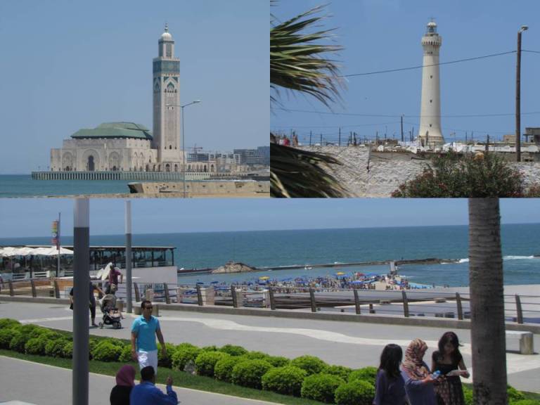 El paseo es agradable, haciendo una corta parada de observación, y utilización de los servicios, en el lujoso “Hotel Le Littoral” durante la hora de almuerzo, para continuar nuestro recorrido por todo el boulevard con un ambiente turístico y local muy distinto. Mucha gente en la playa, es domingo, comiendo en los restaurantes o simplemente paseando por el malecón, muestra un sorpresivo cambio en la percepción del ambiente de Casablanca.