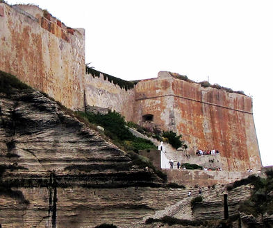 Se ve gente caminando por la parte baja del acantilado que viene de la ya nombrada escalera del rey de Aragón, de 187 escalones, que se utiliza para descender 60 metros en un ángulo muy pronunciado. Fue nombrada así por quién la mandó a construir para invadir Bonifacio.
